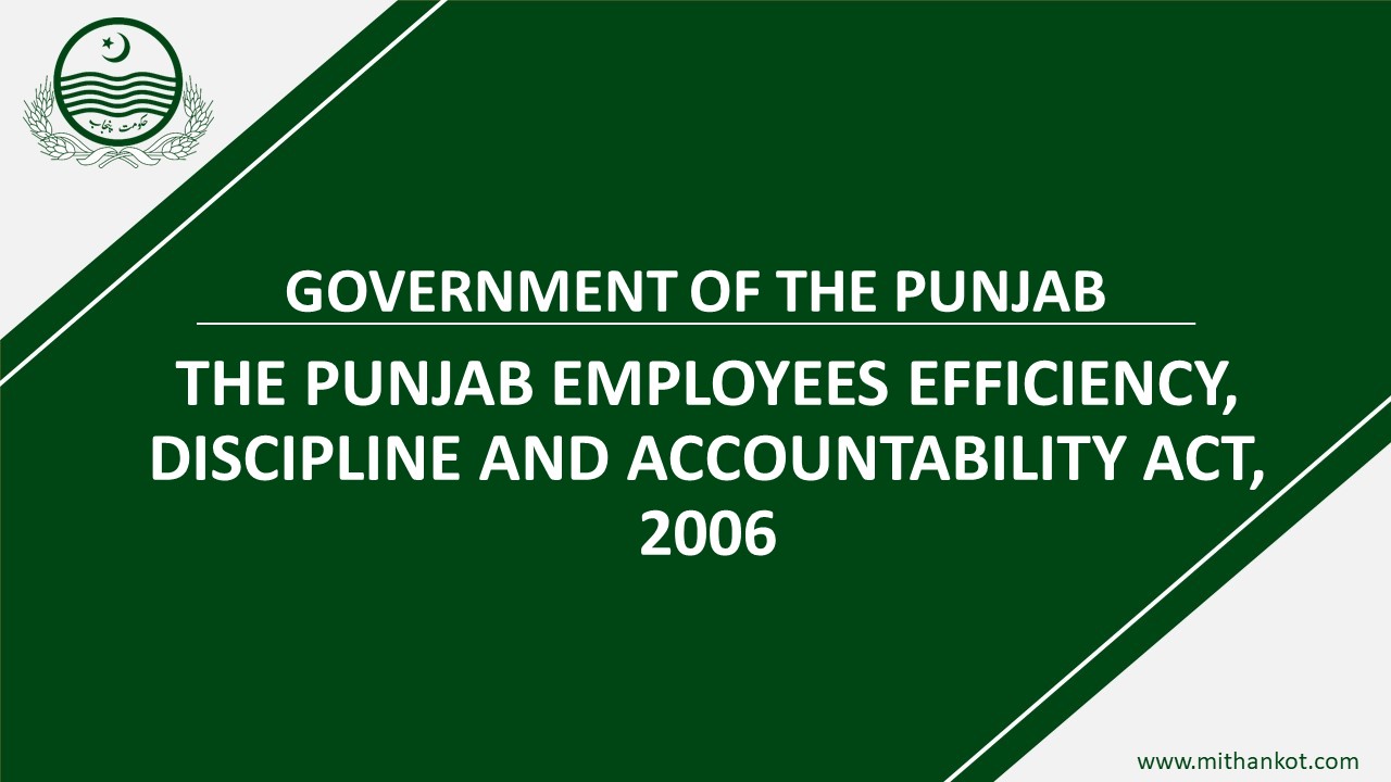 The Punjab Government Act to provide for proceedings against the employees in government and corporation service in relation to their efficiency, discipline and accountability is known as The Punjab Employees Efficiency, Discipline and Accountability Act 2006.