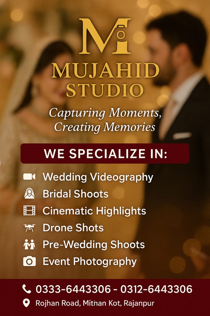 In Kot Mithan, a number of talented movie makers and digital studio owners are bringing creativity to life through their cameras. These professionals specialize in a wide range of visual arts; from wedding video shoots, bridal photography and cinematic highlights to event coverage and short films. With modern equipment, artistic direction and expert editing skills, they transform ordinary moments into captivating visual stories. Their work not only preserves precious memories but also showcases the emerging digital media talent from Mithan Kot.